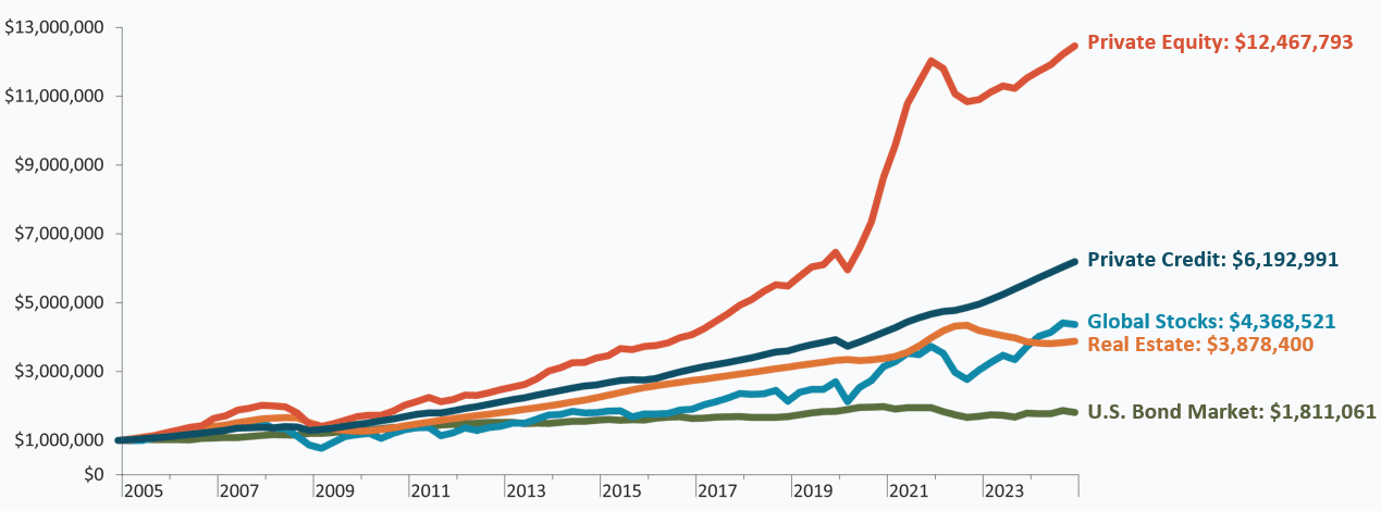 Sources for "Growth of $1 Million" chart: Real Estate (NCREIF) data from 12/31/2004 through 12/31/2024, Private Equity (Cambridge Associates) data from 12/31/2004 through 12/31/2024, Private Credit (Cliffwater Direct Lending Index) data from 12/31/2004 through 12/31/2024. Public Stocks represented by MSCI ACWI Index, Public Bonds represented by Bloomberg US Aggregate Bond Index.